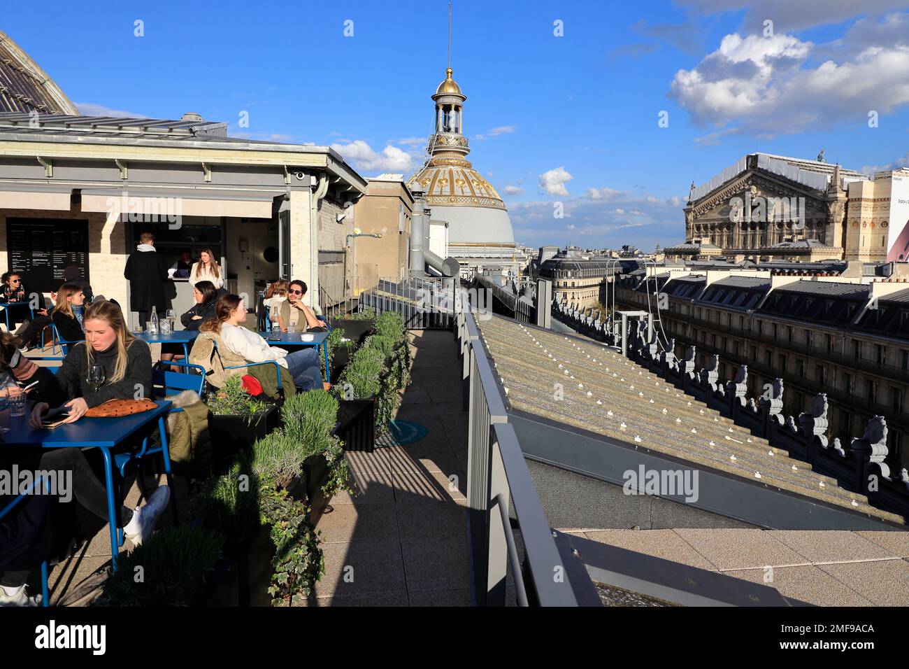 Au Printemps Rooftop Terrace cafe restaurant with customers.Au Printemps Haussmann department