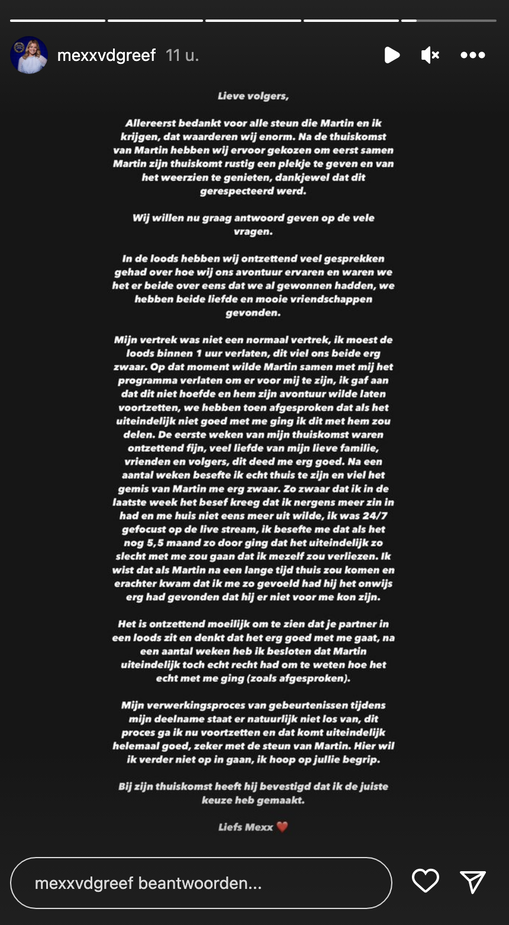 Ook meldt Mexx dat ze binnenkort meer zullen vertellen over de inhoud van de brief waar natuurlijk door fans en kijkers van Een Jaar van Je Leven volop over wordt gespeculeerd. "Wij komen snel terug over wat er in de brief stond. Zoals eerder vermeld zijn de speculaties over de brief niet waar, mijn familie en vrienden staan los van de brief.